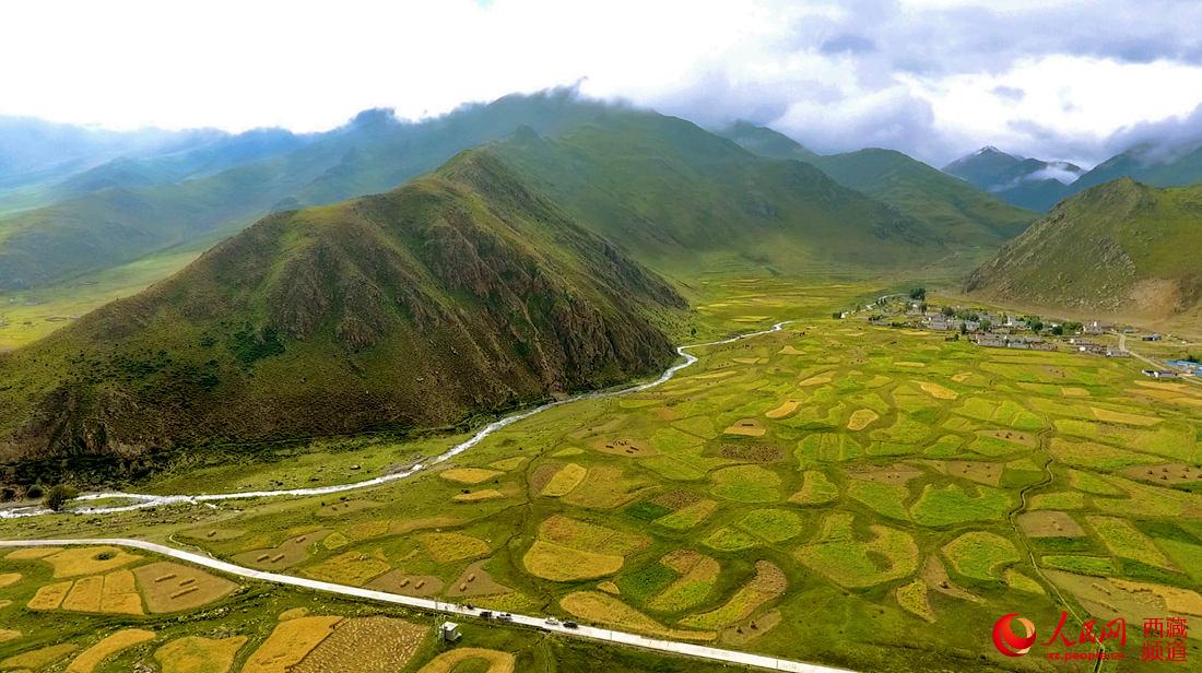 无人机鸟瞰青稞田地。人民网 次仁罗布摄