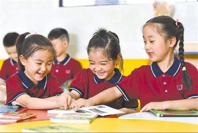 安徽省合肥市幸福路小学一年级的小学生在校园图书角阅读。