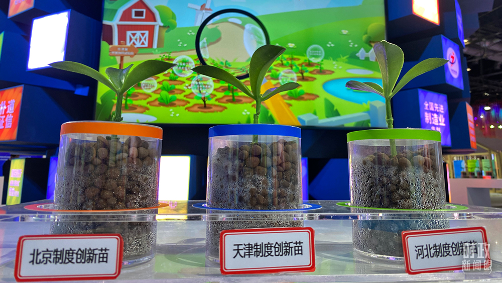 △京津冀三地“协同苗”亮相服贸会。这是一个互动装置,观众可任意取下一棵放在操作台感应区,了解京津冀三地开放创新举措的内容、案例、配图等。(总台央视记者于海燕拍摄)