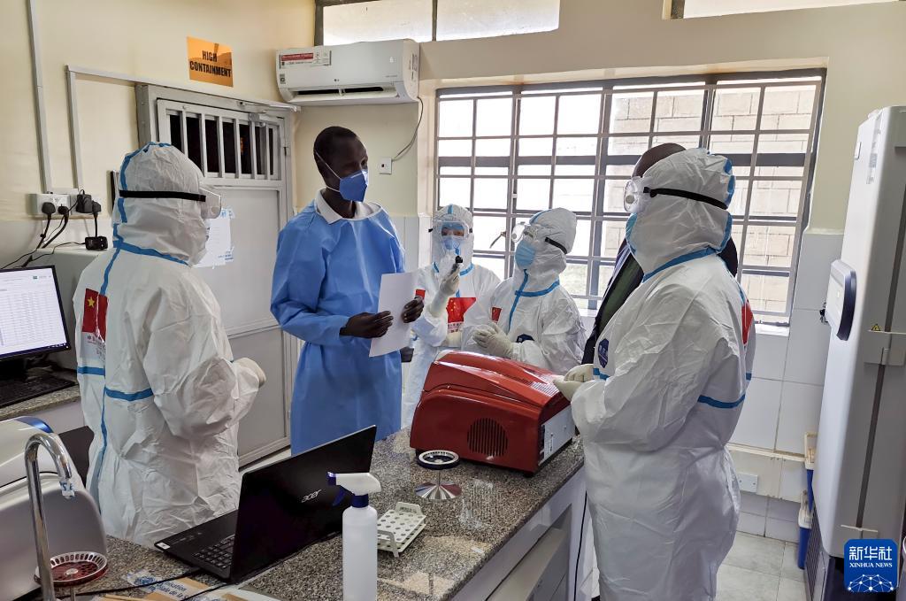 在南苏丹首都朱巴的一处新冠病毒检测机构,中国抗疫医疗专家组成员与南一线医护人员交流(2020年8月21日摄)。新华社发(中国驻南苏丹大使馆供图)