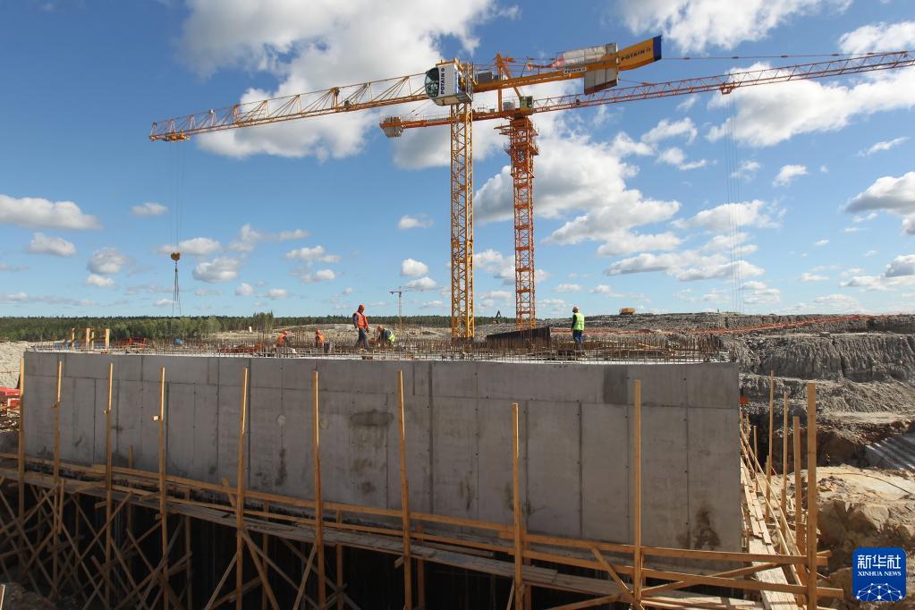 在俄罗斯西北部卡累利阿共和国凯姆河畔,工人在别洛巴罗什水电站施工现场工作(2017年8月15日摄)。别洛巴罗什水电站项目是俄罗斯首个由金砖国家新开发银行提供融资支持的项目。新华社记者 鲁金博 摄