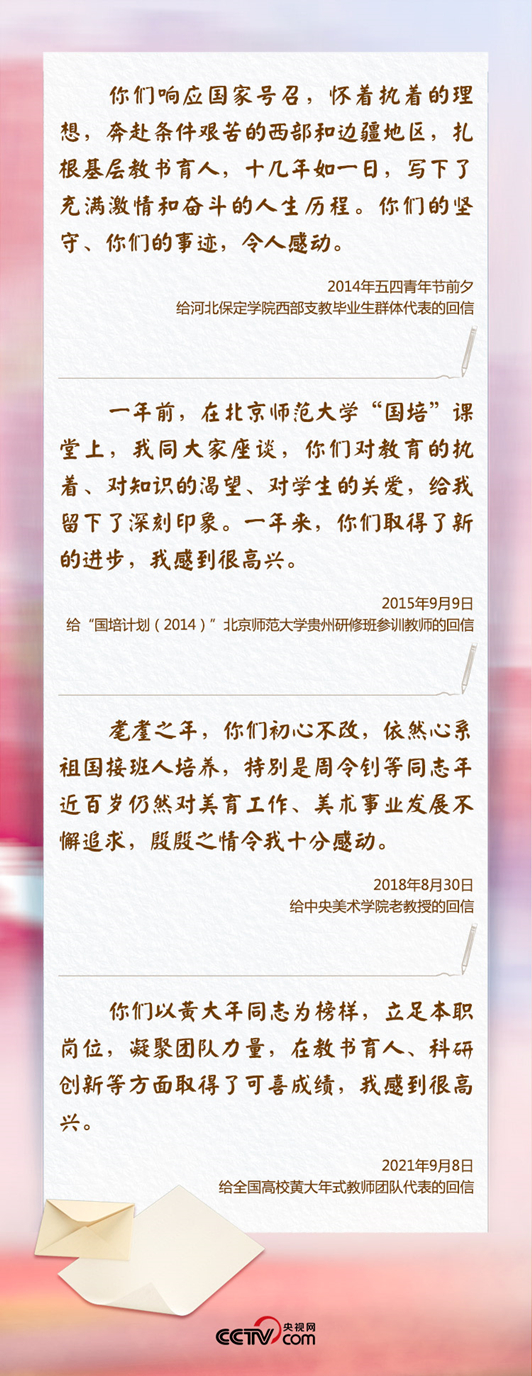 近年来,习近平总书记给不少教师回过信,有曾经面对面座谈的研修班参训教师,有耄耋之年依然心系祖国接班人培养的老教授,也有自愿到祖国西部支教的毕业生群体代表……