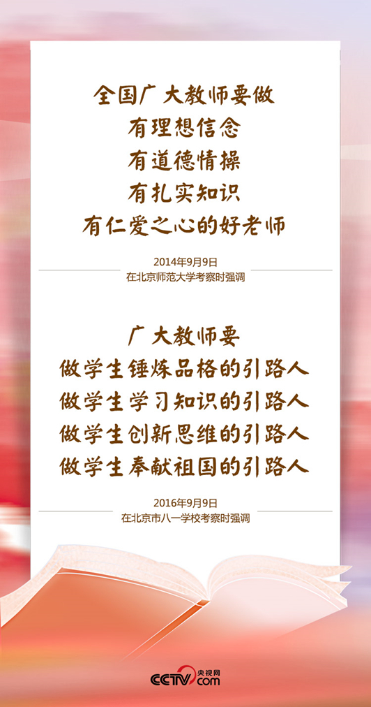 他看了不少优秀教师的事迹,“很多事迹感人至深、催人泪下”。吉林大学教授黄大年“心有大我、至诚报国”、河北农业大学教授李保国把毕生精力投入到山区生态建设和科技富民事业之中……总书记为他们点赞,要求在广大教师中、在全社会大力宣传和弘扬优秀教师的先进事迹和高尚品德。