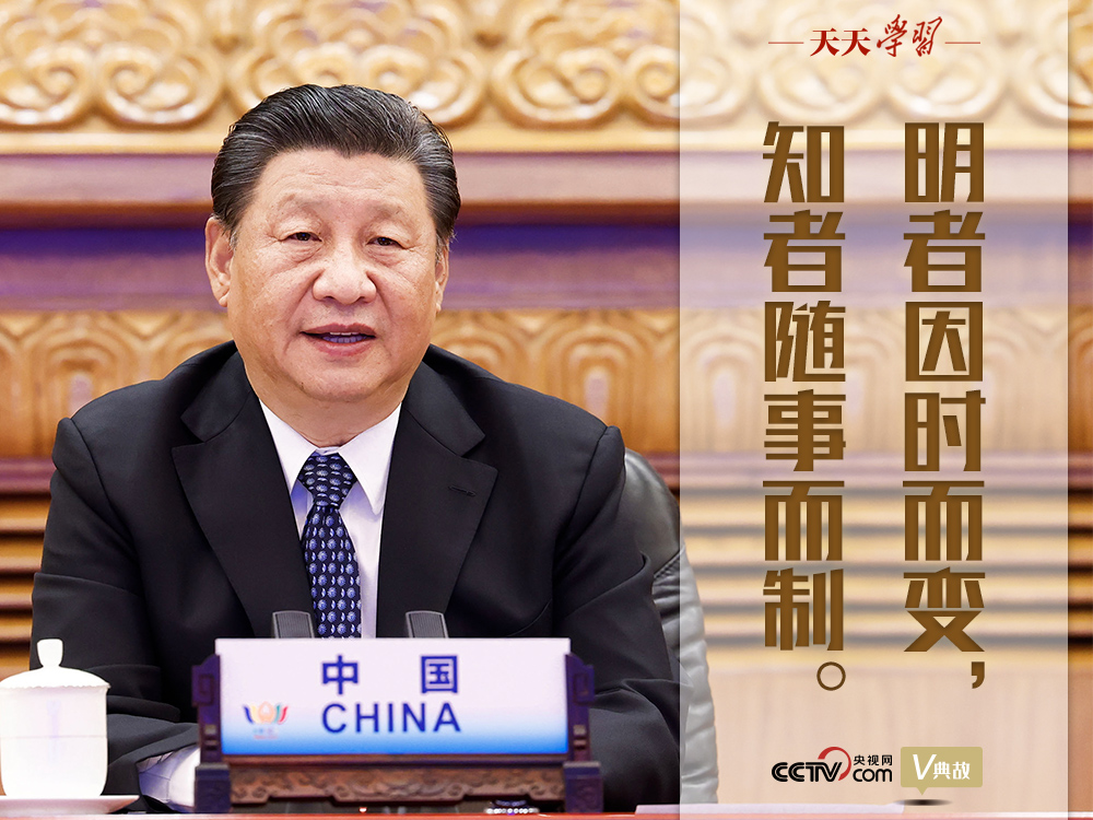 “明者因时而变,知(zh,古同‘智’)者随事而制”出自西汉桓宽的《盐铁论》,习近平将原文中的“随世而制”化用为“随事而制”。意思是,聪明的人会随着时代的变化而改变策略,有智慧的人会按照世事变化的情况而制定法则。这句话强调了“变”的重要性和必要性,主张与时俱进,积极地根据时代发展要求做出适当的调整,反对因循守旧。