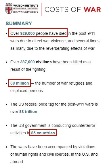 美国布朗大学的研究显示,20年来,美国在全球85个国家发起的战争和军事行动造成多达92.9万人死亡,至少3800万人流离失所。这还只是“非常保守的估计”。而由此引发的大量侵犯人权暴行更是难以胜数。