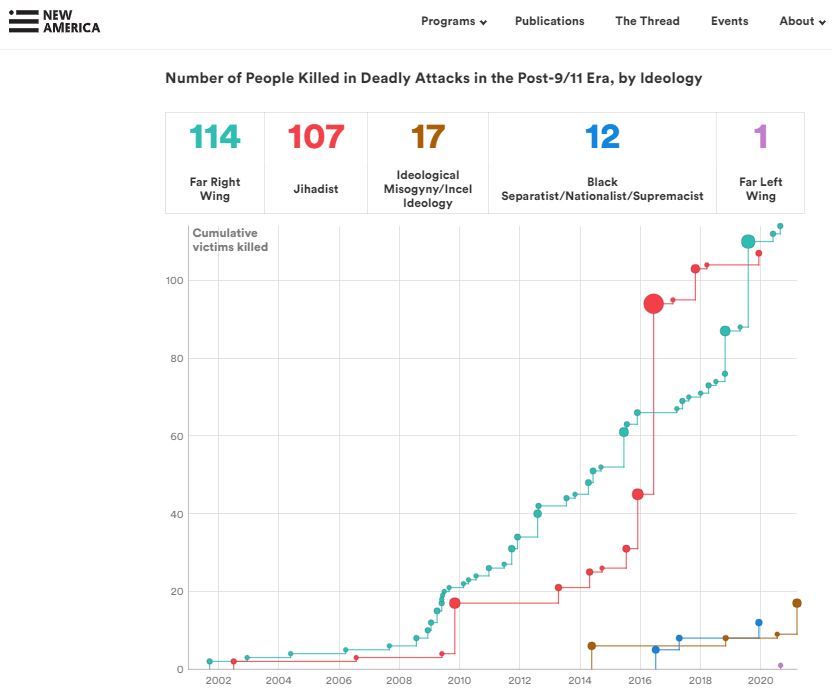 华盛顿智库“新美国”的报告指出,2002年至2020年,美国共有107人死于所谓“圣战”分子发动的袭击;而美国本土的白人至上主义者、反政府民兵等极右翼恐怖分子的袭击造成114人死亡,比“圣战”分子制造的袭击更致命。