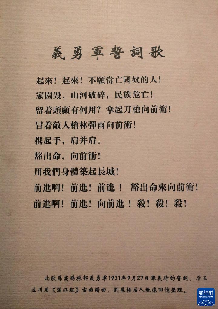 在东北抗日义勇军纪念馆拍摄的《义勇军誓词歌》歌词(7月21日摄)。新华社记者 蔡湘鑫 摄