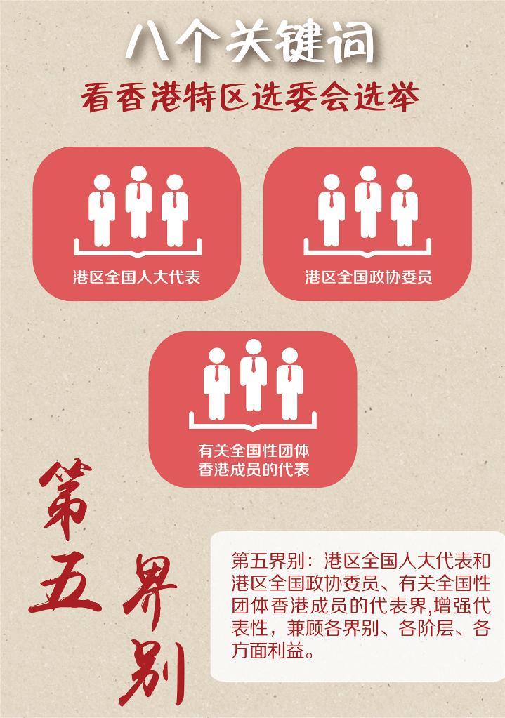 选委会组成由原来的四大界别扩至五大界别,第五界别为“香港特别行政区全国人大代表、香港特别行政区全国政协委员和有关全国性团体香港成员的代表界”。增加第五界别,有利于增强选委会的代表性,体现选委会兼顾各界别、各阶层、各方面利益。全国性团体的香港成员都是香港社会相关领域的进步代表,能有效增强选委会的代表性和先进性。此外,这种安排还有利于强化国家意识,有利于促进香港融入国家发展大局。