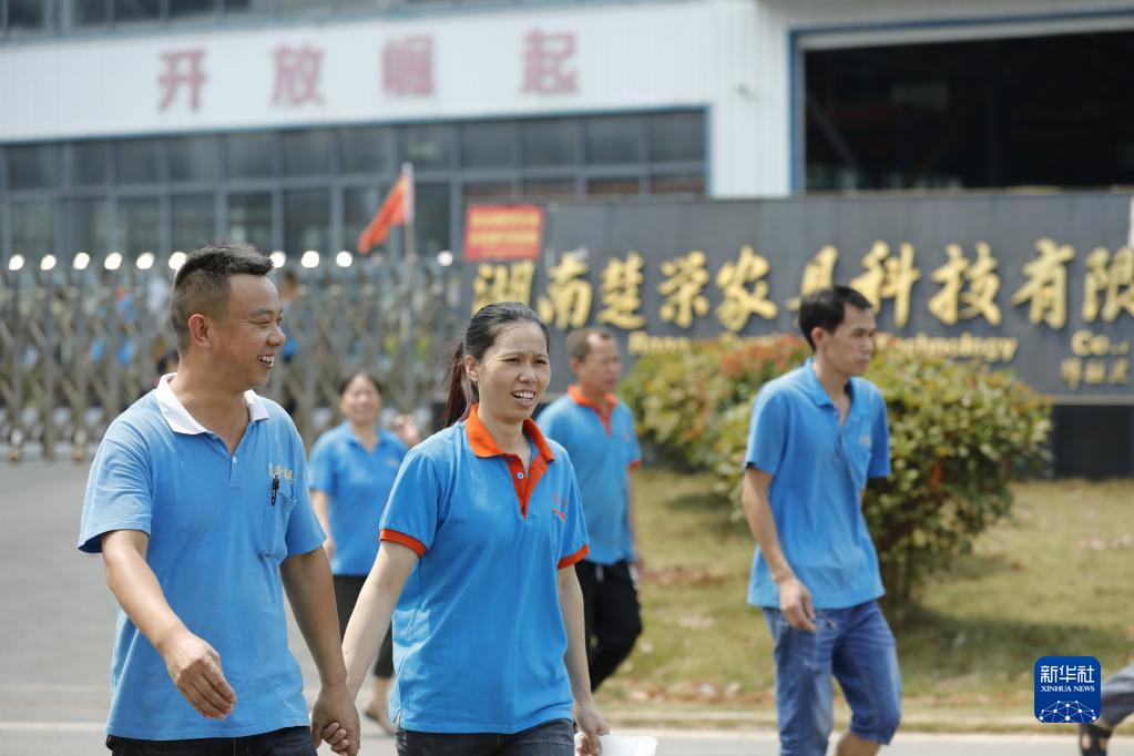 9月17日,陈辉(左一)和妻子中午下班后走在湖南广东(桂阳)家居智造产业园里。 新华社发(戴奇成 摄)