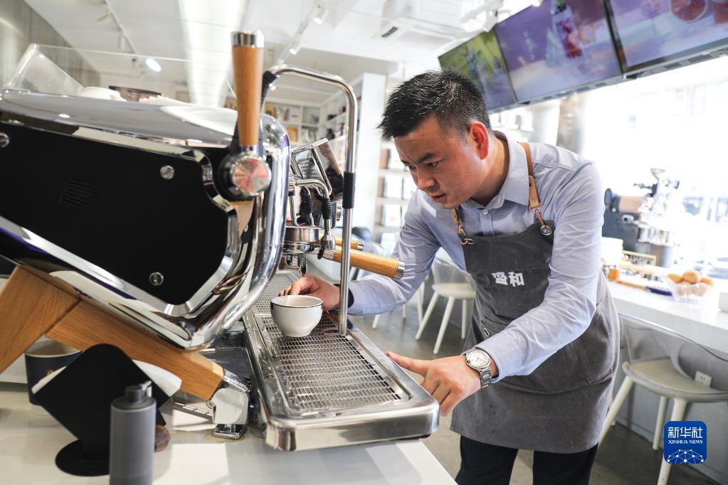 9月18日,景建华在位于湖南长沙高桥大市场的咖啡店内工作。 新华社发(赵菲 摄)