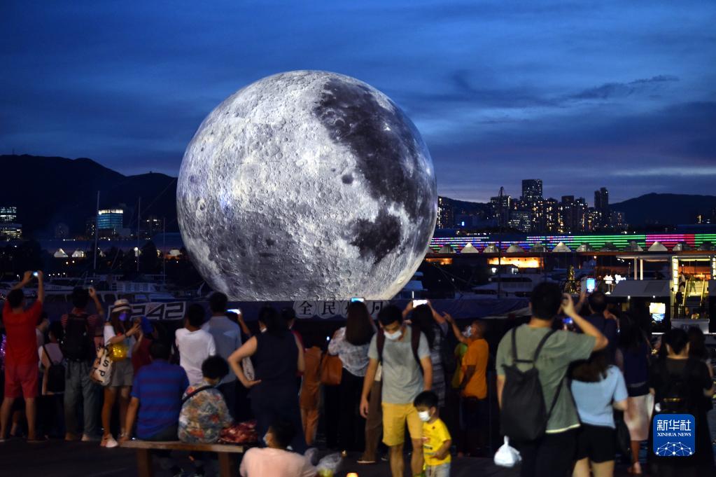 当日, 香港观塘海滨长廊旁装置了高达15米的巨型发光“月亮”,吸引不少市民前来观看。新华社记者 卢炳辉 摄