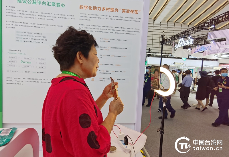 在阿里巴巴展台,参展商在现场直播销售乡村特产。(中国台湾网 张亚静 摄)