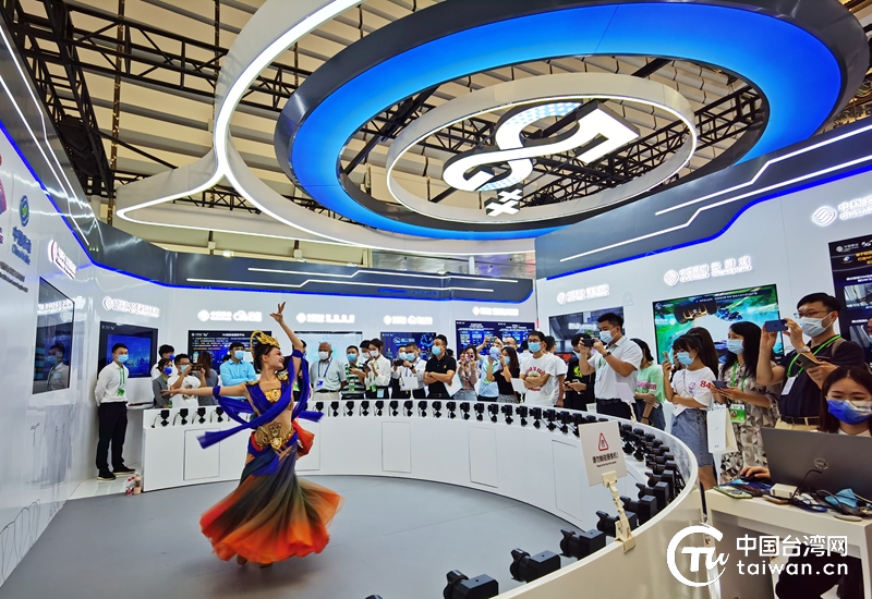 在中国移动的展厅里,一位舞蹈表演者正在翩翩起舞,身后的屏幕同步显示着舞者不同角度的舞姿。据介绍,这就是今年运用在全运会的中国移动“5G自由视角技术”。(中国台湾网 张亚静 摄)