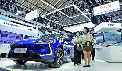 观众在2021年“互联网之光”博览会华为展台上参观电动汽车。光明网记者 季春红摄/光明图片