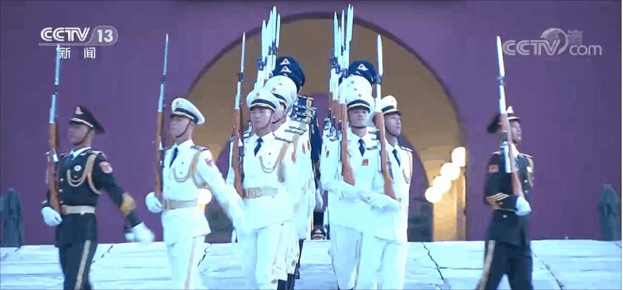 10月1日的国庆升旗仪式比日常规模更大,也更加庄重,平时66人组成的护旗方队增加到96人。仪式开始时,在天安门城楼上会有解放军军乐团的8名礼号手吹响升旗号角。号角声中,由 96名仪仗官兵组成的护旗方队从天安门城楼中央的券门出发,行经金水桥,30名礼兵肃立两侧迎接国旗。当护旗方队行进到金水桥南侧时,从齐步走变换为正步走穿过长安街。最后,护旗方队行进到升旗区域,在军乐团的现场演奏中,五星红旗迎着国庆日的第一缕阳光冉冉升起。