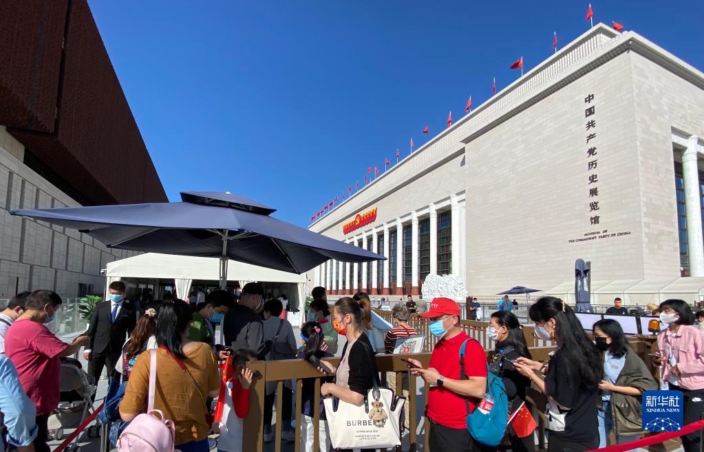 10月1日,人们在中国共产党历史展览馆入口处排队入馆。