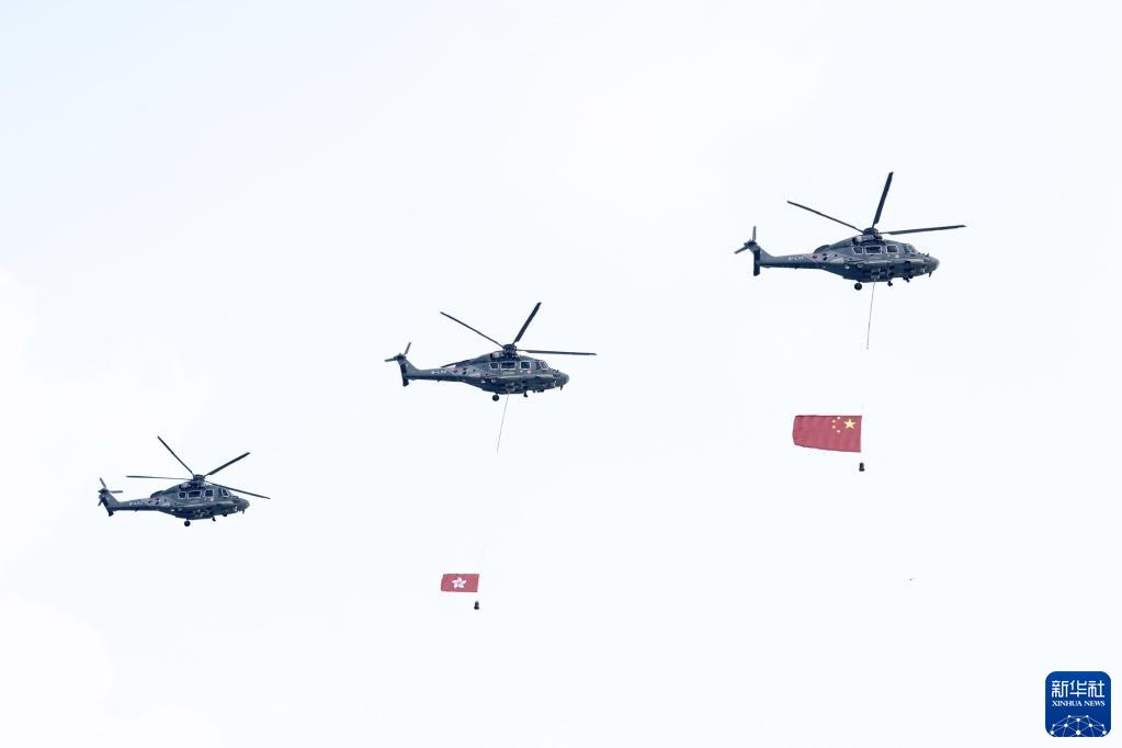 在香港警察银乐队的奏乐中,仪仗队和护旗队迈着中式步操进入广场。悬挂着国旗和区旗的特区政府飞行服务队直升机轰鸣着飞过维港上空,消防处灭火轮喷洒着高高的水柱从水面驶过。