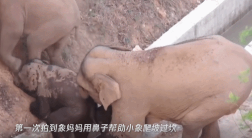 △第一次拍到象妈妈用鼻子帮助小象爬坡过坎