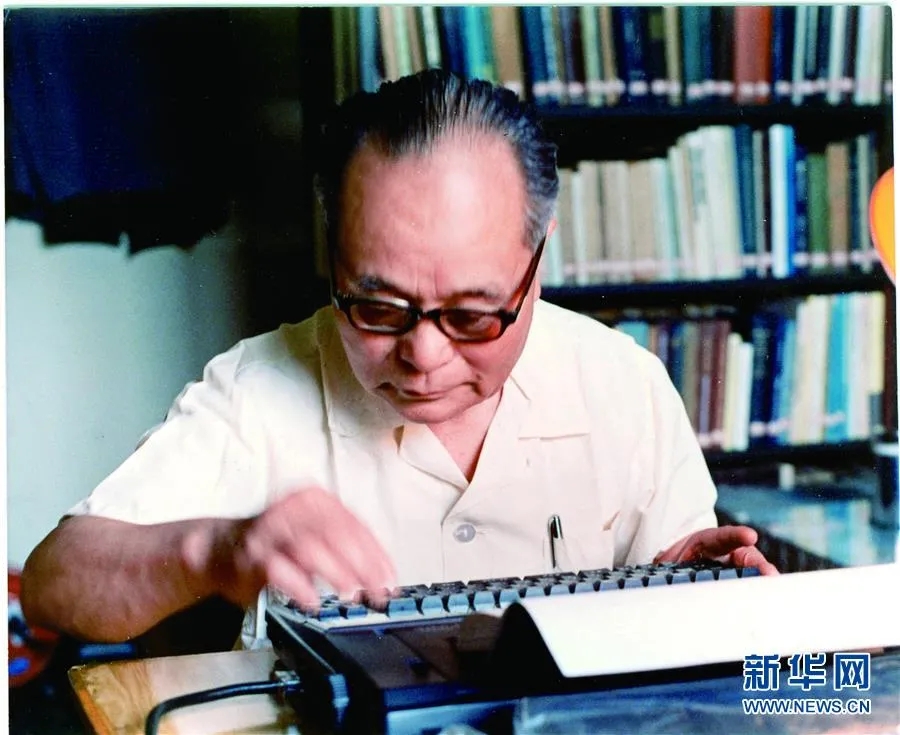 程开甲在打字机上撰写论文(资料照片)。新华社发