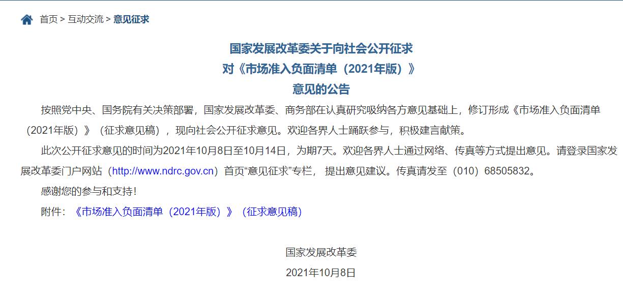 中新网10月9日电 据国家发改委网站消息,国家发改委8日就《市场准入负面清单(2021年版)》向社会公开征求意见。征求意见稿提及,禁止违规开展新闻传媒相关业务。