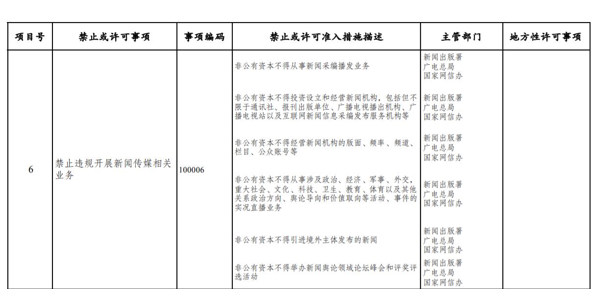 2、非公有资本不得投资设立和经营新闻机构,包括但不限于通讯社、报刊出版单位、广播电视播出机构、广播电视站以及互联网新闻信息采编发布服务机构等。