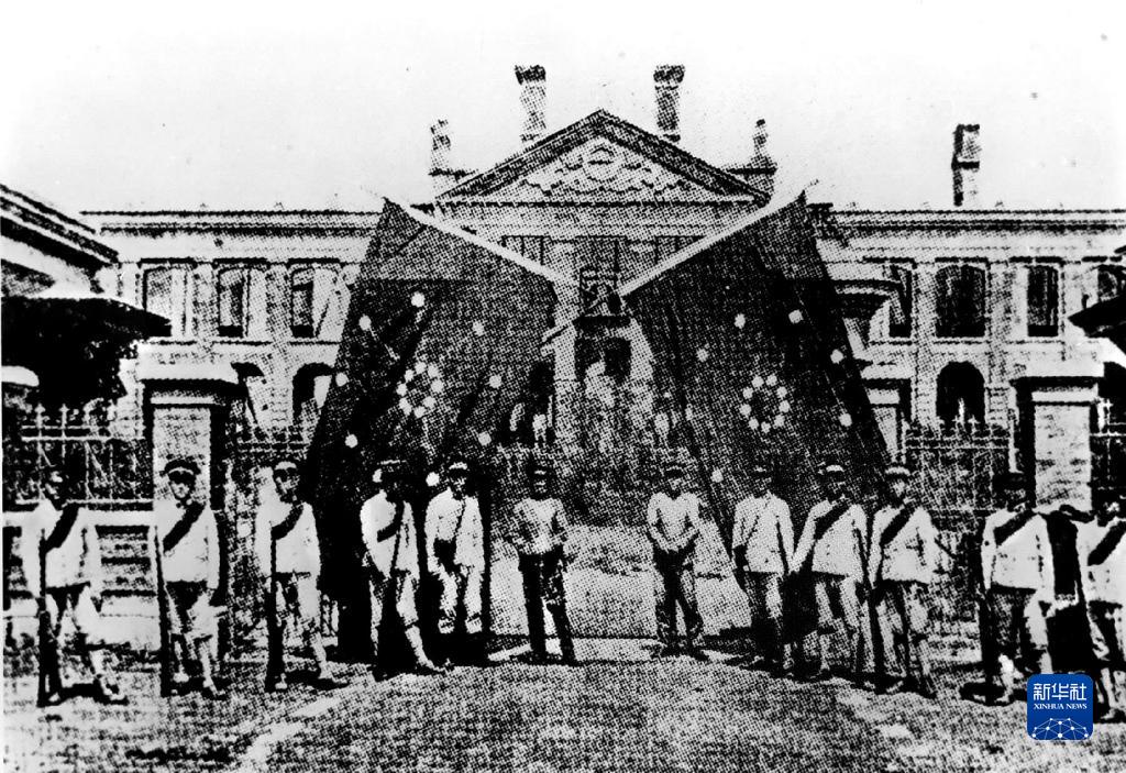 图为革命军占领武昌城后,军政府挂起象征十八省团结一致的十八星军旗(资料照片)。