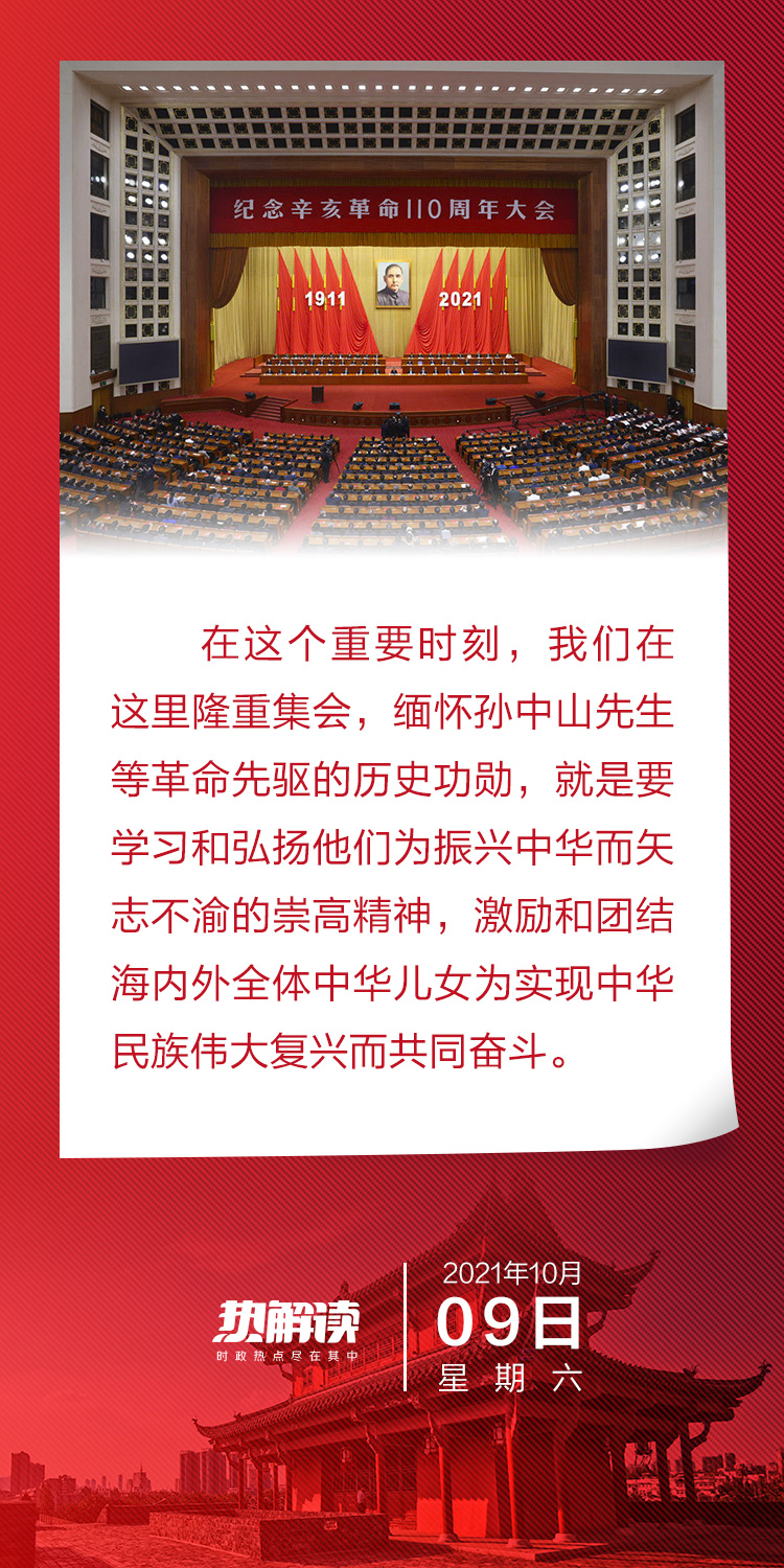 热解读10月9日,人民大会堂万人大礼堂红幅高悬,“纪念辛亥革命110周年大会”大字庄严醒目,主席台上方悬挂孙中山先生画像,精心布置的礼堂尽显庄重。