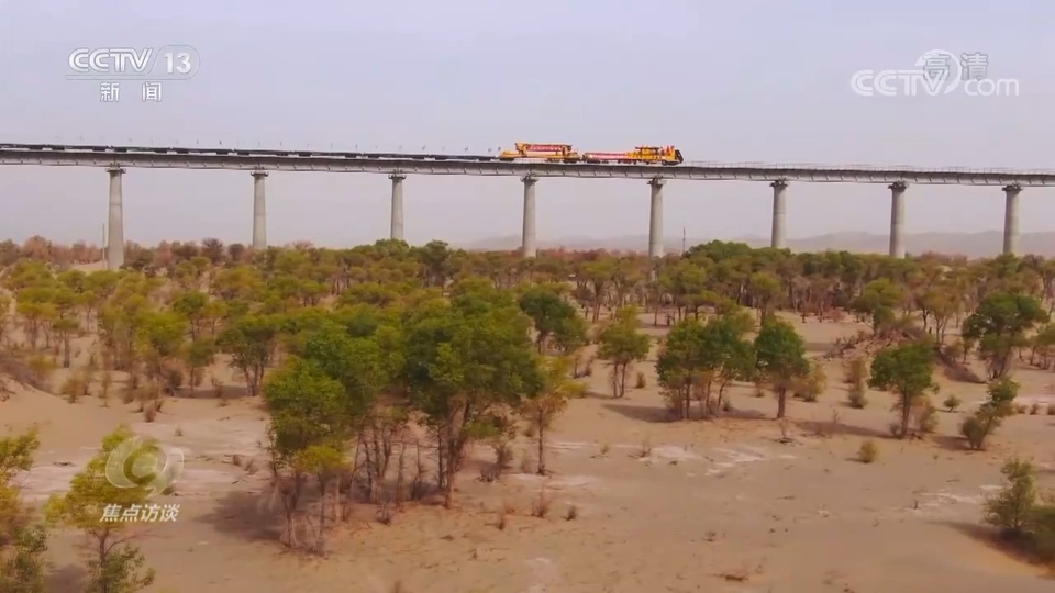 塔克拉玛干沙漠位于塔里木盆地中心,是我国最大的沙漠,也是世界第二大流动性沙漠。为了铁路顺利建成,和若铁路在全国铁路建设中首次开展工程防沙与植物防沙相结合的防治措施,建设阻沙沙障、储沙沙障、固沙沙障,栽种各种适合沙漠生长的乔木、灌木,成活率达到了85%,治沙效果日益明显。9月27日,新疆和田至若羌铁路完成最后的铺轨工作,这也意味着世界上首条沙漠环线铁路——环塔克拉玛干沙漠铁路正式闭合。