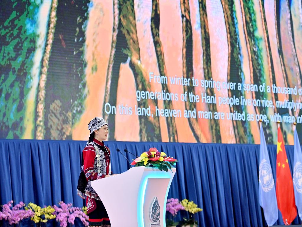 波光粼粼的梯田,农人辛勤地耕作,鸭子在水里欢快地游……大屏幕播放着云南红河哈尼梯田的视频,身着民族服饰的中国少数民族青年代表施晓悦讲述了那里人与自然和谐共生的故事。