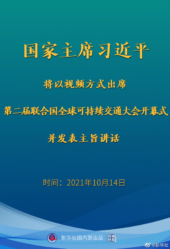 新华社北京10月13日电 外交部发言人华春莹13日宣布:国家主席习近平将于10月14日以视频方式出席第二届联合国全球可持续交通大会开幕式并发表主旨讲话。
