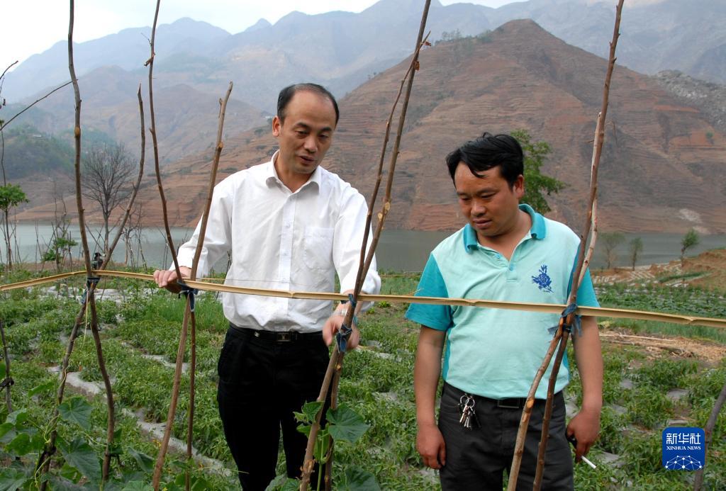 姜仕坤(左)在贵州晴隆县长流乡与村民交流(资料照片)。
