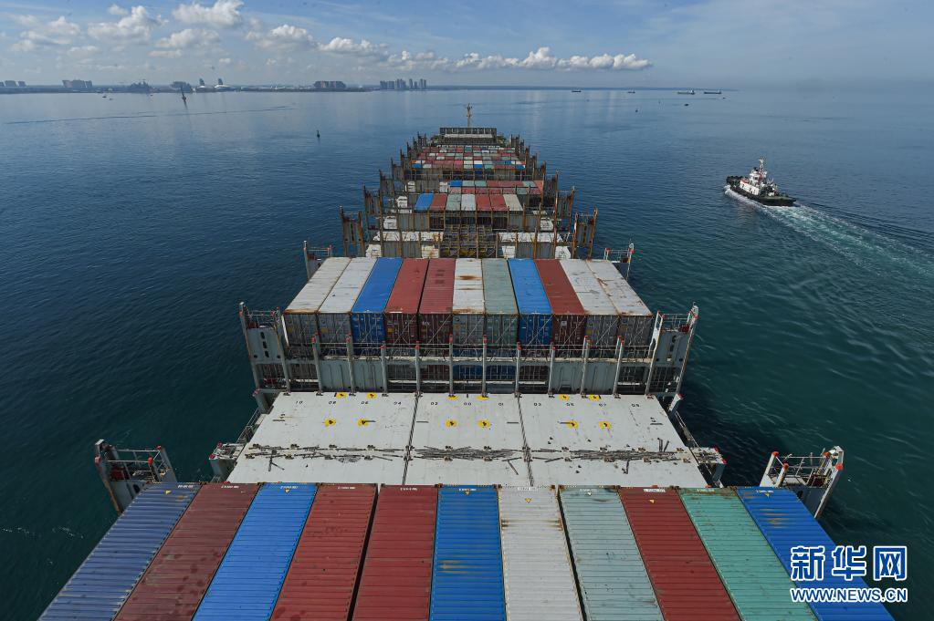 这是2020年9月23日拍摄的一艘行驶在海南洋浦港海域的集装箱船。新华社记者 蒲晓旭 摄