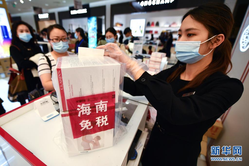 1月7日,海口日月广场免税店的工作人员在打包免税品。新华社记者 郭程 摄