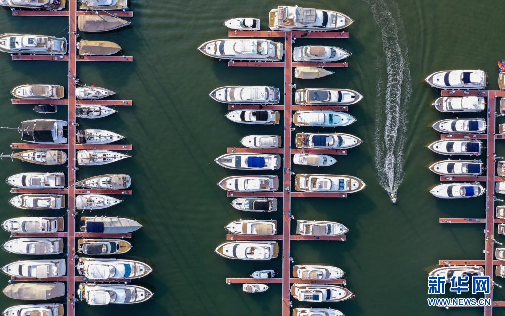 这是在三亚鸿洲国际游艇会码头停靠的游艇(2020年3月11日摄,无人机照片)。新华社记者 郭程 摄