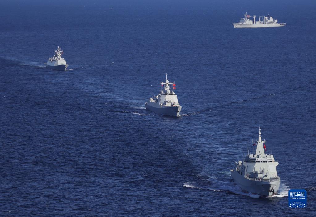 10月15日,在俄罗斯彼得大帝湾附近海空域,中国海军舰艇编队在中俄“海上联合-2021”联合军事演习期间航行。