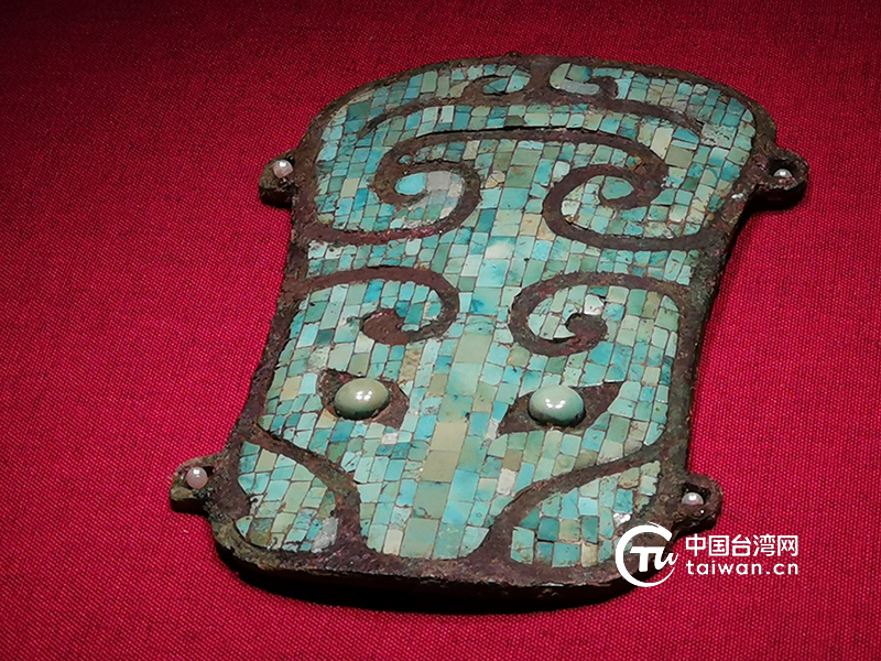 二里头遗址出土的镶嵌绿松石兽面纹铜牌饰。上有数百片绿松石拼合镶嵌出兽面纹,加工精巧,丝丝入扣,虽历经三四千年却无一松动脱落。(中国台湾网 李杰 摄)