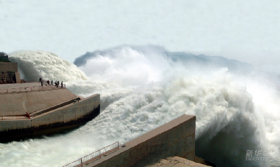 黄河小浪底水利枢纽工程开闸放水,调水调沙(2004年6月19日摄)。