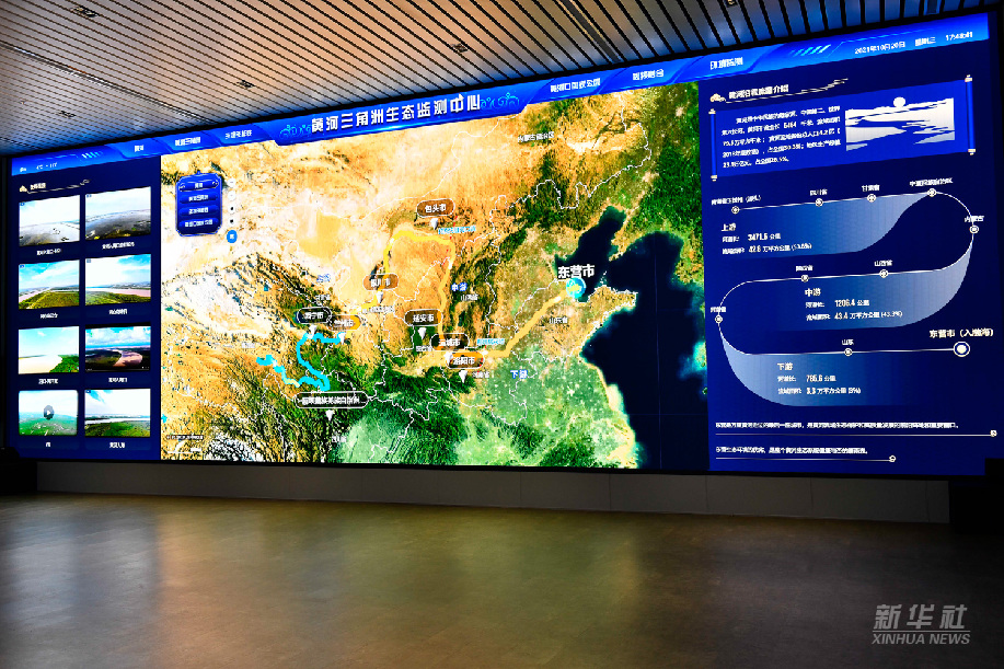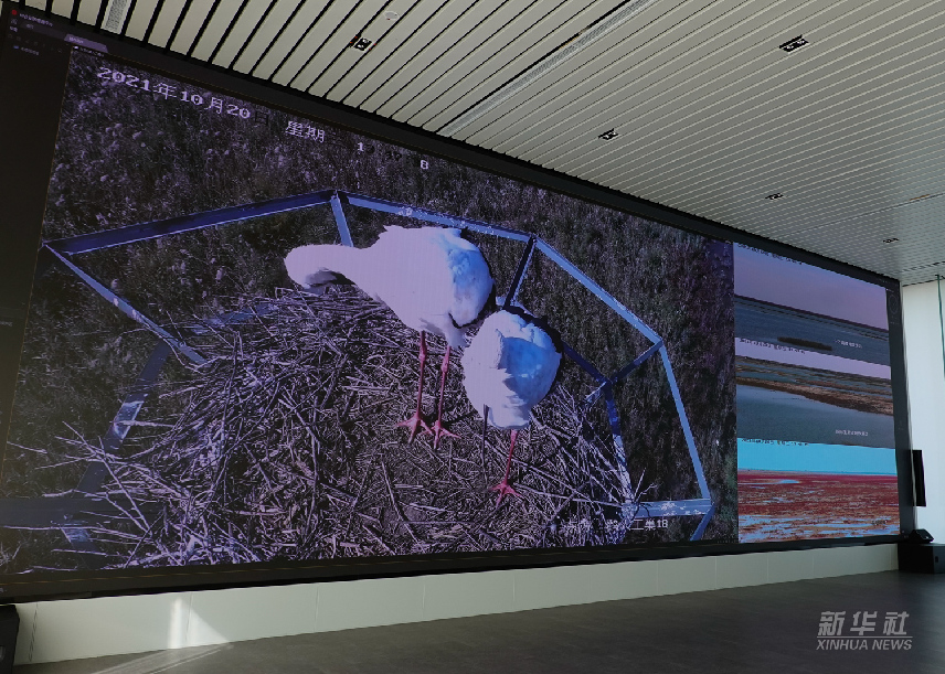 黄河三角洲生态监测中心智慧大屏上显示的保护区监控画面和相关数据(2021年10月20日摄)。