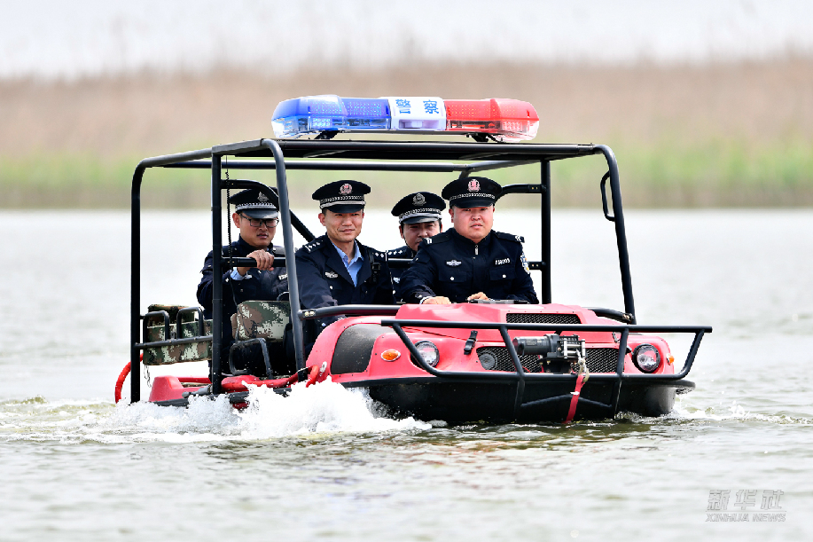 在山东黄河三角洲国家级自然保护区,民警杨华章(前排左)乘坐水陆两栖巡逻车和同事们巡查(2021年5月1日摄)。