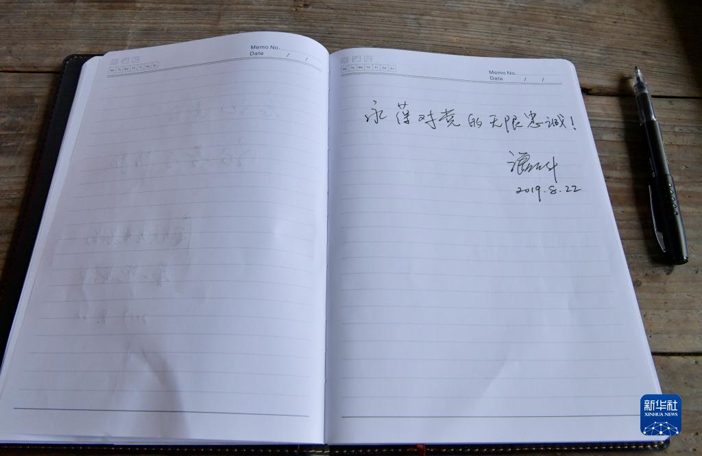 潘东升参加主题党日活动,手书“永葆对党的无限忠诚”(2019年8月22日摄)。新华社发(福州市公安局供图)