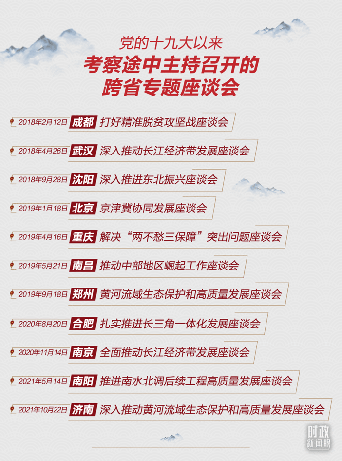 《时政新闻眼》梳理发现,加上这次座谈会,党的十九大以来,习近平总书记在考察途中一共主持召开了11场跨省座谈会。除了3场聚焦脱贫攻坚、南水北调外,其他8场关注的都是区域协调发展的重大战略和部署。
