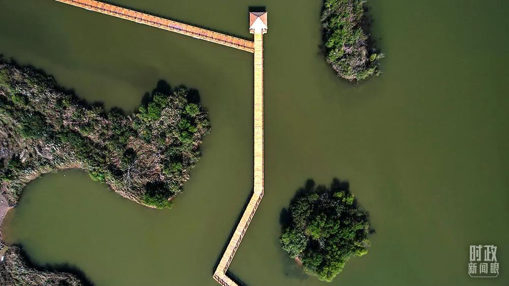△黄河三角洲,延伸到水中的木质栈道。(总台国广记者李晋拍摄)
