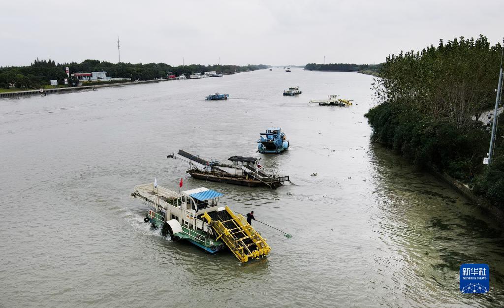 2020年10月15日,苏浙沪三地的保洁船在太浦河水域联合清理水面浮游植物(无人机照片)。新华社记者 方喆 摄