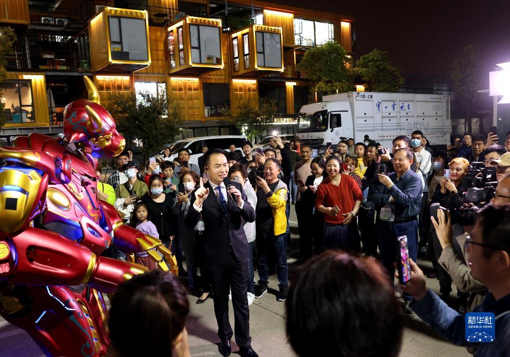 2021年4月30日,消费者在上海市智慧湾“五五购物节”活动现场了解导购机器人。新华社记者 陈飞 摄