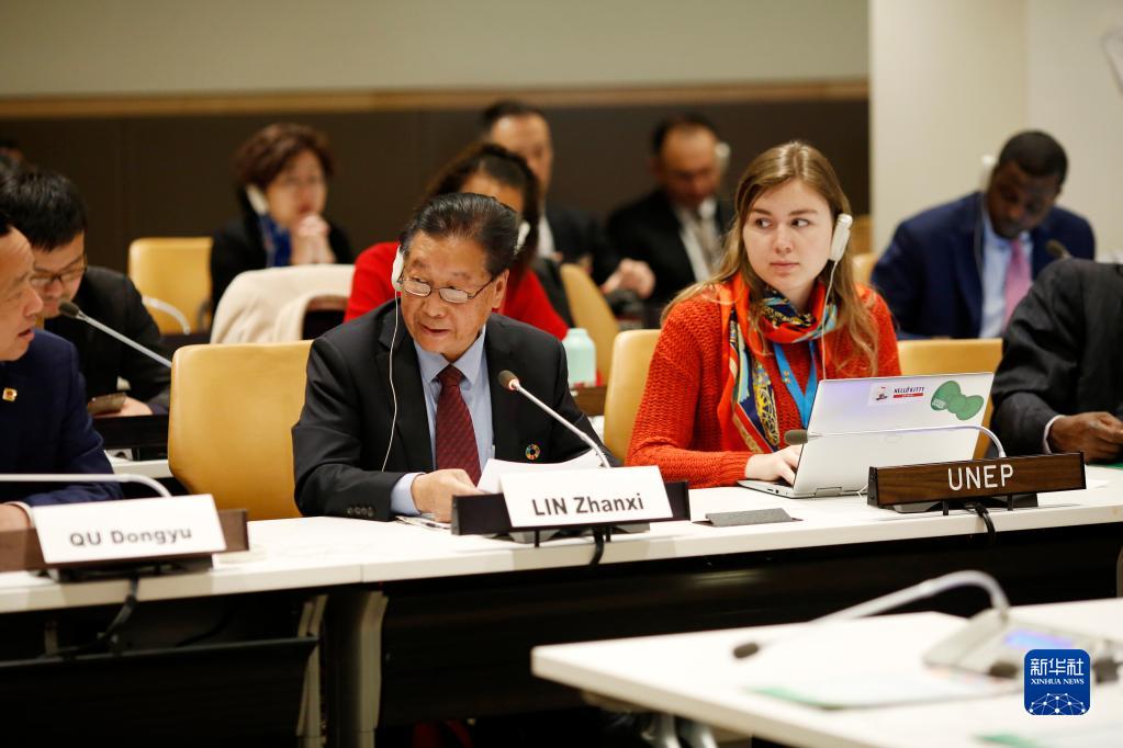 2020年4月18日,在位于纽约的联合国总部,菌草技术发明人、福建农林大学研究员林占熺(前排中)在“菌草技术:‘一带一路’倡议对促进落实联合国2030年可持续发展议程的实质性贡献”专题研讨会上发言。菌草技术是来自中国福建省的一项技术。中国研究人员发现,一些草本植物可替代木头用于培育菌类,这就是菌草。菌草可被用于生产多种食品、饲料、肥料以及生物质能源等,还可用于生态环境保护和治理。这项技术投入少,见效快,效益高。菌草已经扎根100多个国家,“一带一路”沿线的不少发展中国家朋友称它是来自中国的“扶贫草”,有人干脆称之为“中国草”。新华社记者 李木子 摄