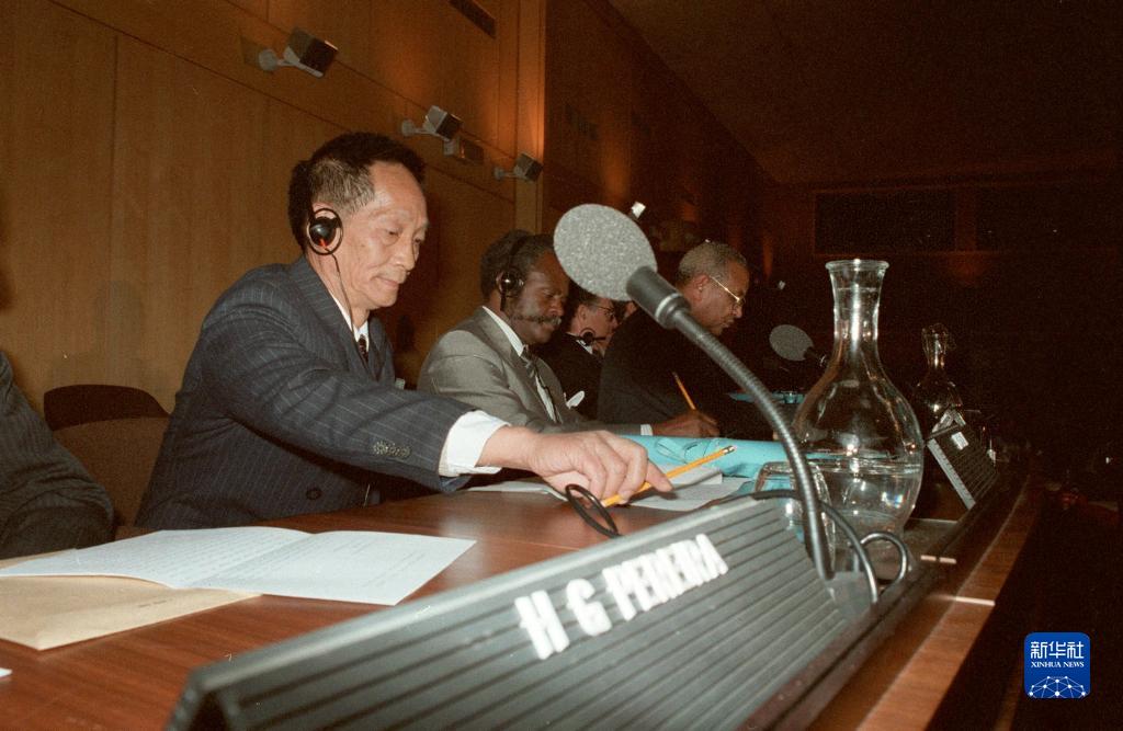 1987年11月3日,联合国教科文组织在法国巴黎向中国杂交水稻专家袁隆平颁发了科学奖,以表彰他在培育高产杂交水稻方面取得的卓越成果。这是袁隆平在颁奖大会上。新华社记者 吕全成 摄