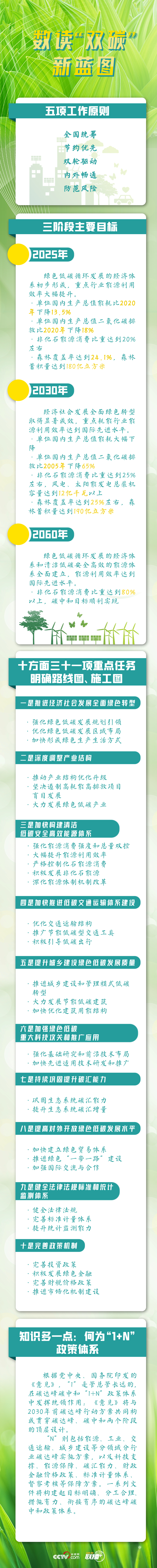 按照统一部署,国家正加快建立“1+N”政策体系,立好碳达峰碳中和工作的“四梁八柱”。何为1,何为N,具体又有哪些小目标?《联播+》数读《意见》,与您一起学习。