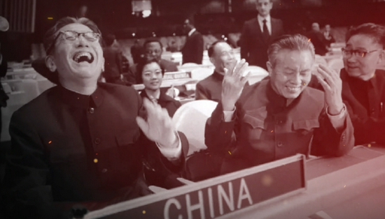 即便被乔冠华酣畅的笑所吸引,记者的镜头依然没有忽略眼前这个大大的“China”,这是中华人民共和国恢复联合国常任理事国的闪亮标识。
