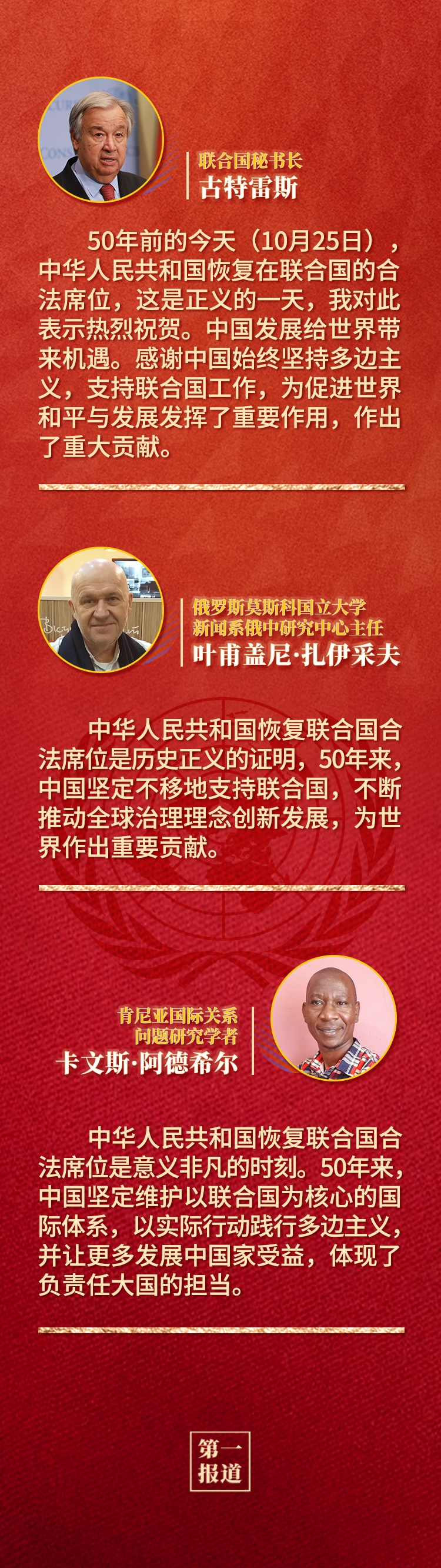 1971年10月25日,第二十六届联合国大会以压倒性多数通过第2758号决议,决定恢复中华人民共和国在联合国的一切权利,承认中华人民共和国政府代表是中国在联合国的唯一合法代表。这是中国人民的胜利,也是世界各国人民的胜利。这是世界公道正义的胜利,也是联合国宪章宗旨和原则的胜利。自此,占世界人口近四分之一的中国人民在联合国有了真正代表。联合国的普遍性、代表性和权威性得到切实增强,世界和平与发展的力量得到空前壮大。