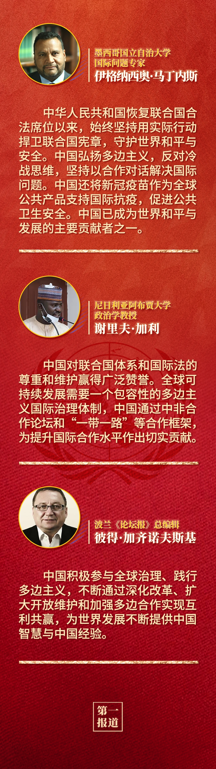 多国人士认为,中华人民共和国恢复联合国合法席位是世界和联合国历史上的一个大事件,习近平主席的重要讲话回顾了中国和平发展、造福人类的50年,为实现世界永续和平发展提出重要倡议,为全球共同推动构建人类命运共同体注入新的强大动力。